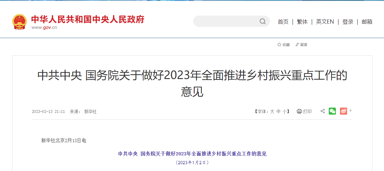據悉,2月13日,新華社發(fā)布《中共中央 國務院關于做好2023年全面推進鄉(xiāng)村振興重點工作的意見》(下稱“2023年中央一號文件”),文章給出了2023年鄉(xiāng)村振興工作的指導意見,對2023年的鄉(xiāng)村振興工作做出了全面安排。