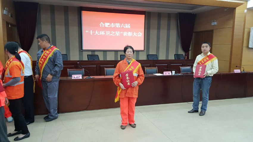 2015年10月26日是合肥市第20個環(huán)衛(wèi)工人節(jié),合肥報業(yè)傳媒集團與合肥市城市管理局聯(lián)合舉辦“合肥市第六屆十大環(huán)衛(wèi)之星”表彰大會中,我司楊遠芹受到“十大環(huán)衛(wèi)之星”表彰。